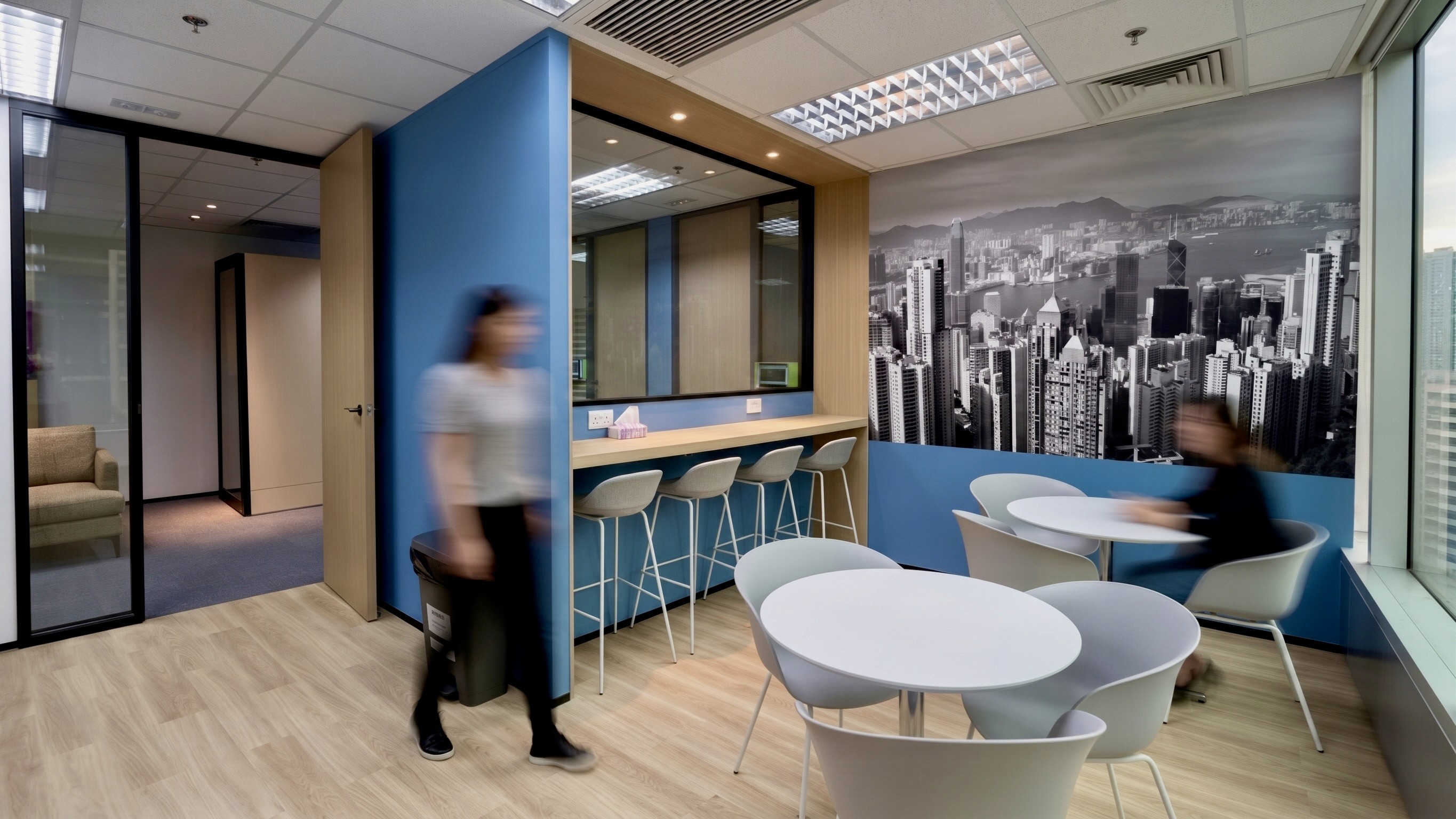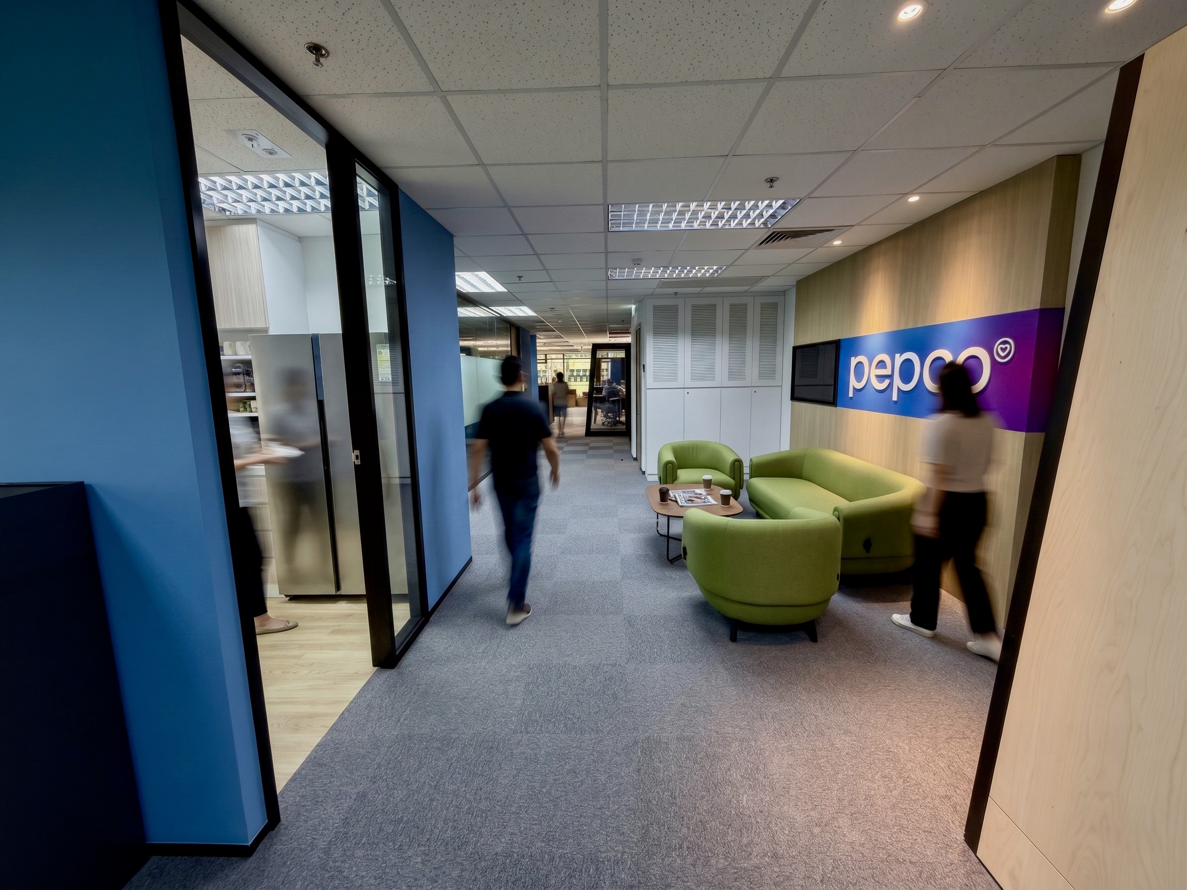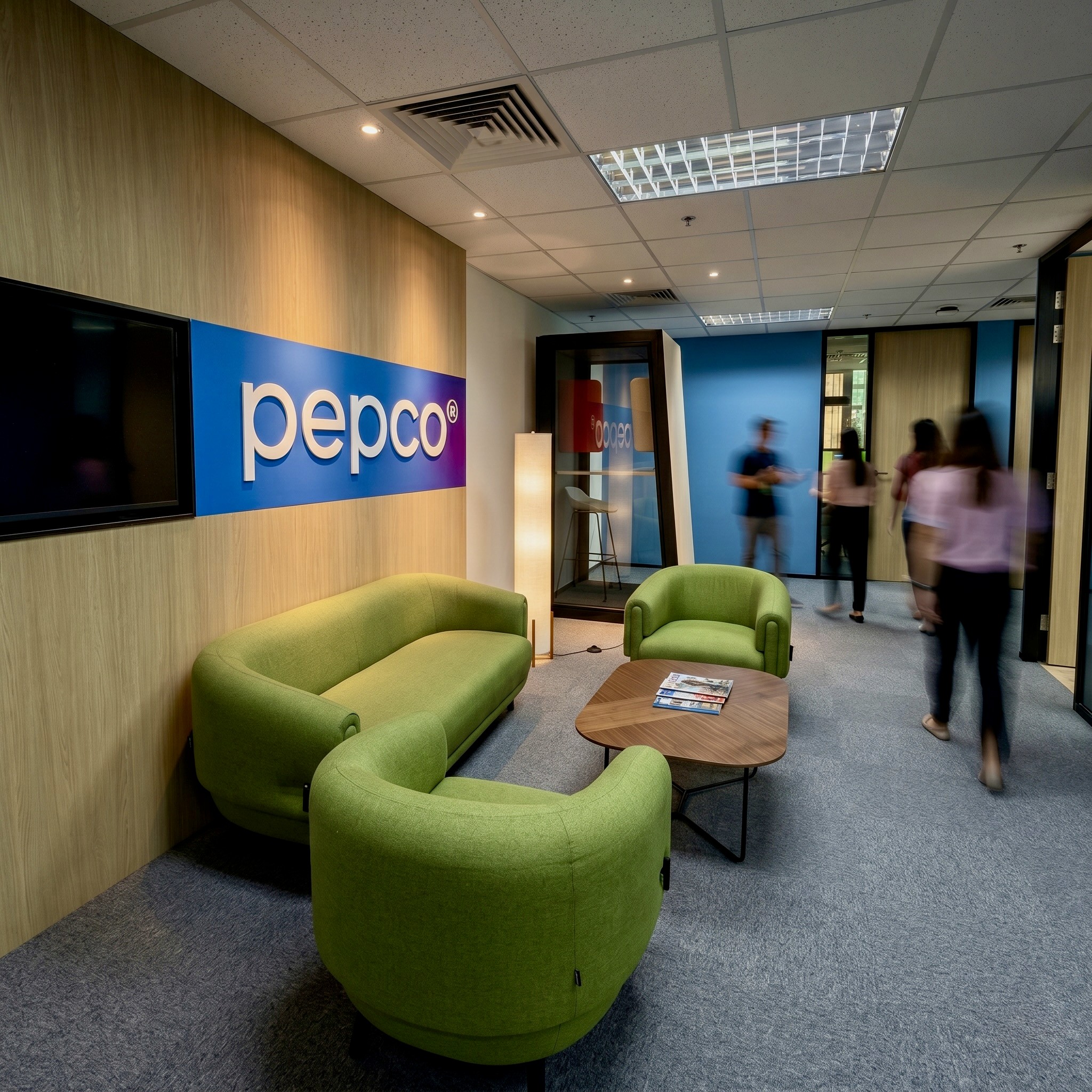 The Pepco office is a workspace designed for the leading European retailer to accommodate a growing team of 20 to 28, organized around an open‑plan floor with height‑adjustable workstations. The plan brings together a 10–12 pax conference room, two 6‑pax meeting rooms, acoustic phone booths, and a reception lounge in place of a traditional front desk, complemented by layered breakout zones, that give the floor varied rhythm and posture. A generous pantry with café‑style tables, a high ledge with stools, and full appliance line supports daily use, while dedicated product display areas (shelving bays, pegboard, and locked vitrines) turn brand presence into a functional moment for internal reviews and vendor visits. Support spaces, such as lockers and utility/print room are tucked away to support a tidy environment. A calm material palette was used for the project, with blue, the corporate color and accents of purple contrasting over the warmth of the timber used over the doors, and horizontal surfaces, producing an office that is efficient, brand‑forward, and built to scale.