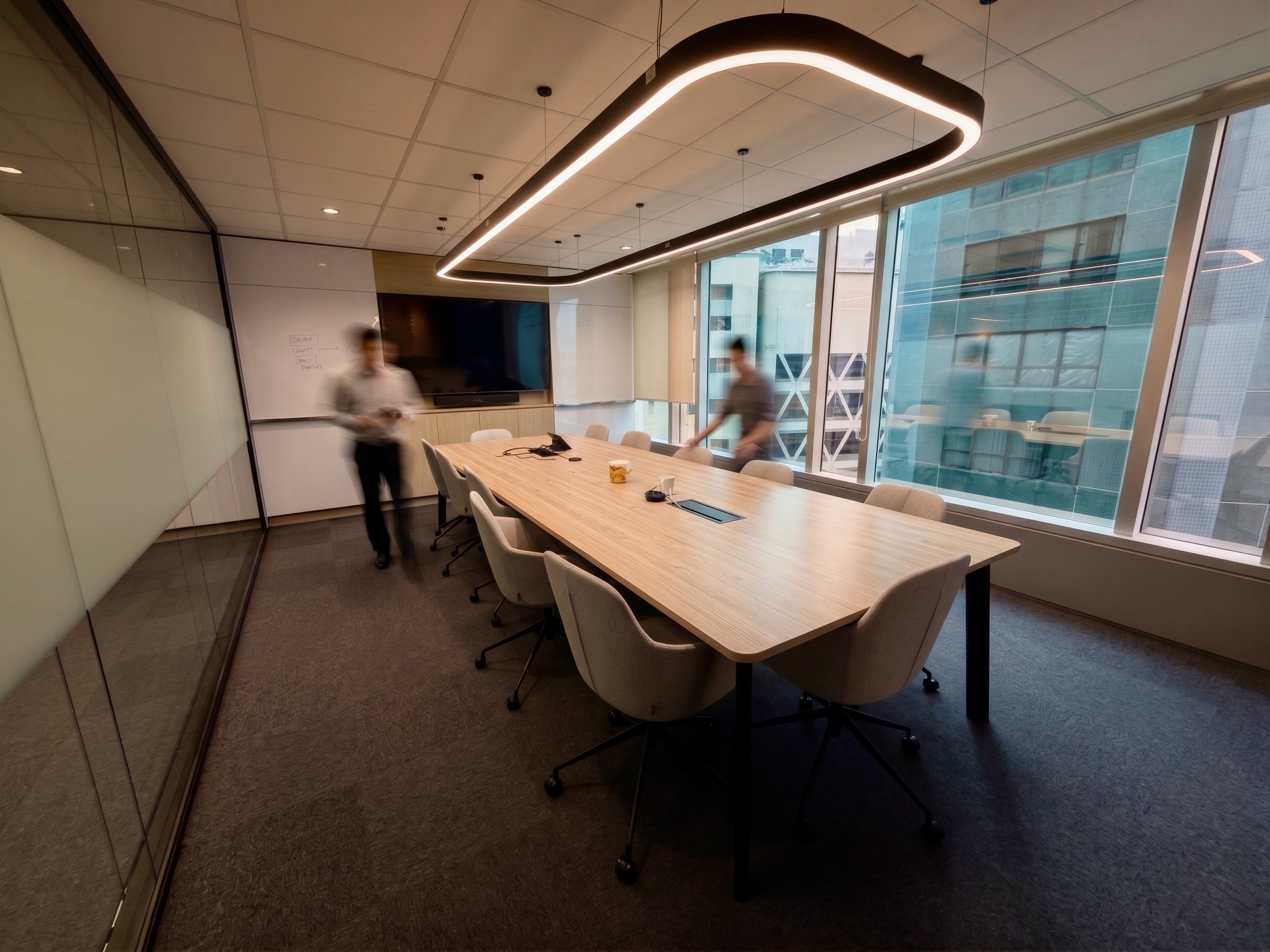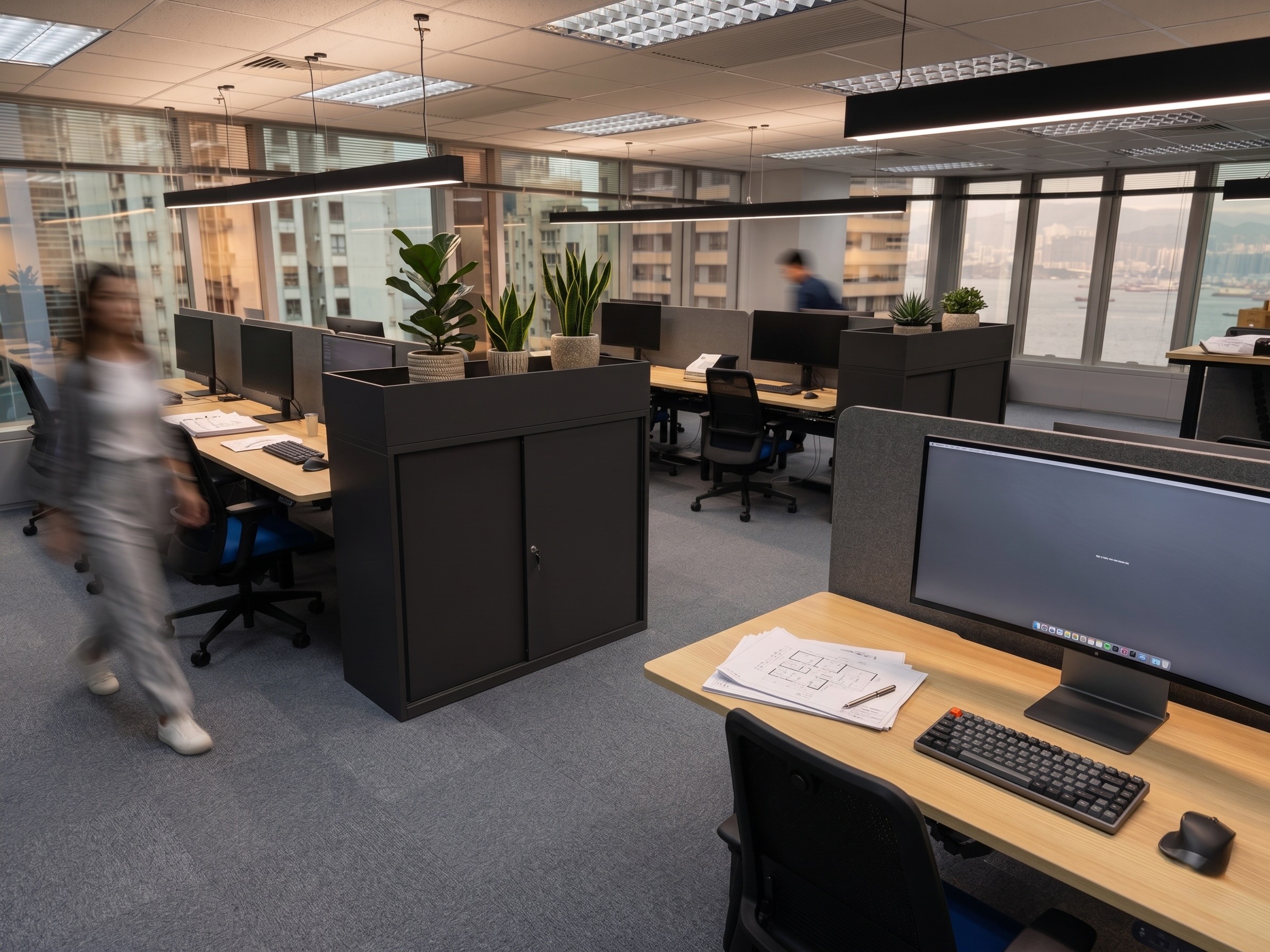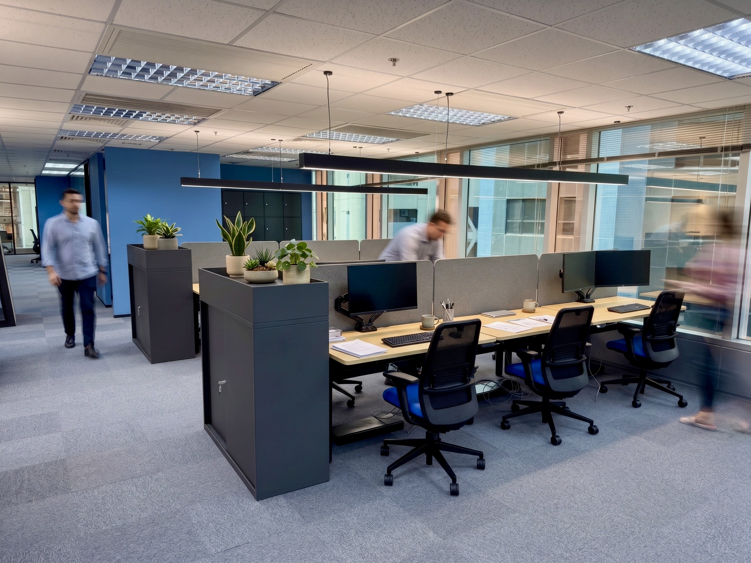 The Pepco office is a workspace designed for the leading European retailer to accommodate a growing team of 20 to 28, organized around an open‑plan floor with height‑adjustable workstations. The plan brings together a 10–12 pax conference room, two 6‑pax meeting rooms, acoustic phone booths, and a reception lounge in place of a traditional front desk, complemented by layered breakout zones, that give the floor varied rhythm and posture. A generous pantry with café‑style tables, a high ledge with stools, and full appliance line supports daily use, while dedicated product display areas (shelving bays, pegboard, and locked vitrines) turn brand presence into a functional moment for internal reviews and vendor visits. Support spaces, such as lockers and utility/print room are tucked away to support a tidy environment. A calm material palette was used for the project, with blue, the corporate color and accents of purple contrasting over the warmth of the timber used over the doors, and horizontal surfaces, producing an office that is efficient, brand‑forward, and built to scale.